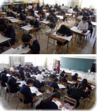 3年生から6年生の子どもたちが、4教科の問題に取り組んでいます。3年生の教室では、初めて冊子の形状のテストに戸惑いながらも真剣に鉛筆を走らせていました。