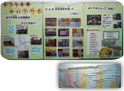 1階の掲示板には「ポプラがっきゅう みいつけた」の掲示物が…。ポプラ学級とは、本校の特別支援学級のことです。「ポプラ学級」のお部屋はどこにあるの?」「どんな学習道具を使っているの?」「ポプラタイムってなあに?」と、ポプラ学級のことについて知らせています。