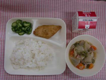 今日は、2学期の給食最終日でした。献立は「ごはん、たらのフライ、豚肉とあつあげの煮もの、あっさりきゅうり、牛乳」でした。たらのフライは衣がサクサクでボリュームもあり、子どもたちに大好評でした。