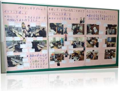 2年生の子どもたちが、パソコンやタブレットを使って、いろいろなことができるようになったと写真を交えて紹介していました。カレンダーやクリスマスカード、時間わり表など。たくさんのものを作ることができました。