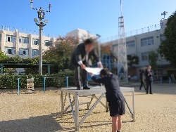 11月10日月曜日、児童朝会で、子どもたちが夏休みに提出した習字作品や図工作品でいただいた証書等の授与をおこないました。4名の児童が前に出て、校長先生から証書や賞品を受けとりました。