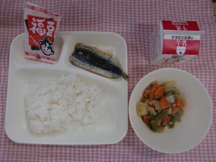 かけ、含め煮、いり大豆、牛乳」でした。いわしは開いたものを焼き物機