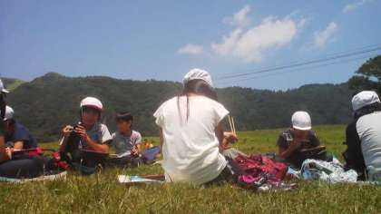 7月25日木曜日、12時、すばらしい青空、すばらしい景色のもとお弁当をいただいています。