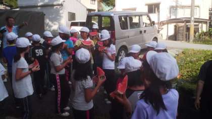 7月25日木曜日4時30分、5年生は宿舎に到着し、スイカをいただいてホッと一息しているところです。よく冷やされていて、ほんとにおいしいんです。