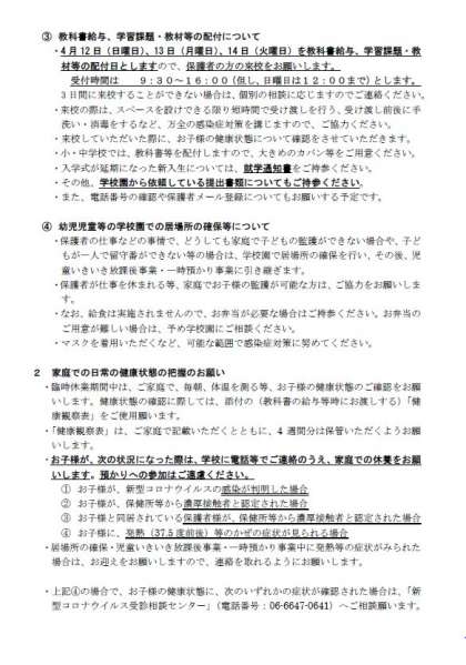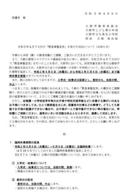4月8日(水) 今般の新型コロナウイルス感染症の拡大に伴い、政府が、令和2年4月7日付けで「緊急事態宣言」を行ったことを受け、大阪市においても、臨時休業を5月6日(水)まで延長します。