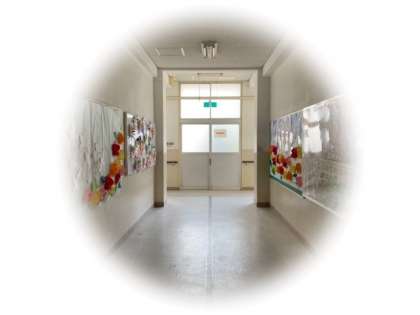 ろうか の りょうがわ には、ざいこうせい の おにいさん・おねえさん が つくった けいじぶつ が あります。