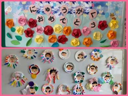 1つは、「にゅうがく おめでとう」と かいてあります。しん1ねんせい の ために 、 みんなで つくりました。