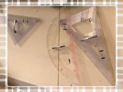 2つめ は、じゅぎょう の ときに、せんせい が つかう どうぐ だよ。なまえ を しってる? まんなか に あるのが、「ぶんどき」というよ。ひだり と みぎ に あるのは、2つ セット で、「さんかくじょうぎ」というんだよ。しってたかな?