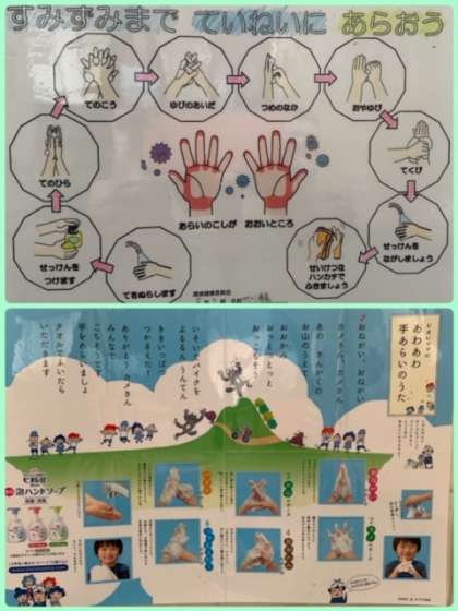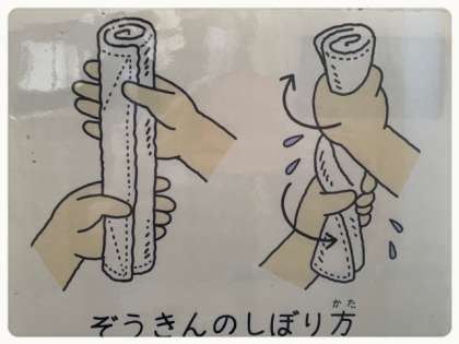 「てあらいば」 には、 「て の あらいかた」や「ぞうきん の しぼりかた」 の せつめい も はってあります。「て の あらいかた」 は、ようちえん や ほいくえん でも 、 おしえて もらっていますね。