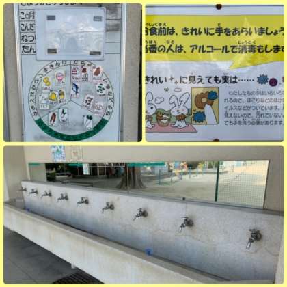 「きゅうしょくとうばん」 は、 まず、 「きゅうしょくしつ」 の まえ にある 「てあらいば」 で、しっかり て を あらいましょう。