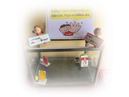 「きゅうしょくしつ」 の なか に はいると、 ケース の なか に、きゅうしょく の みほん が ようい されています。もりつけかた を しっかり みて、きょうしつ で 、おなじように じゅんび できるように、 せんせいの おてつだい をしてね。