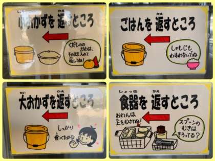 「きゅうしょくしつ」 の なか は、「おくばしょ」 が きまっています。あとで かえす ときにも、 かくにんして おいてくださいね。