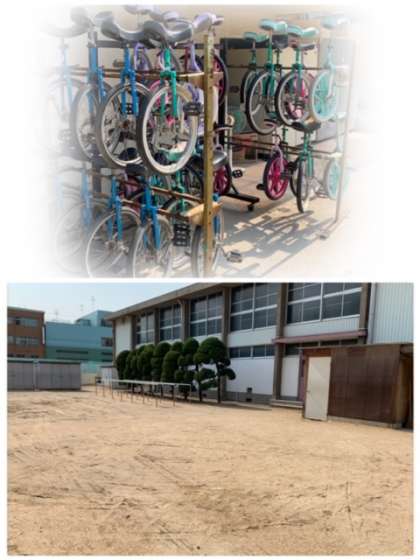 「きゅうしょくしつ」 の よこ には、「いちりんしゃ あそびば」 が あります。 ひろい スペース が あるので、 あんしん して、 「いちりんしゃ」 に のることが できます。