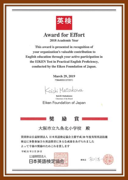 日本英語検定協会より奨励賞をいただきました。子どもたちの努力が、いろいろなところで認められています。(残念ながら今年度の第1回目の英検団体申し込みはないと、西中学校から連絡をいただいています。)