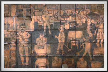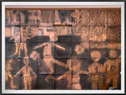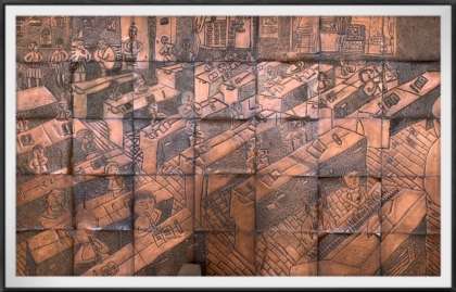 したえ に あわせて、 「へら」 や 「くぎ」 などで、 「どうばん」 を おしていって 「え」 を えがいていく さくひん だね。