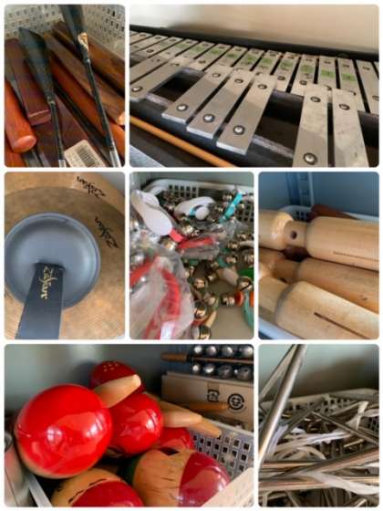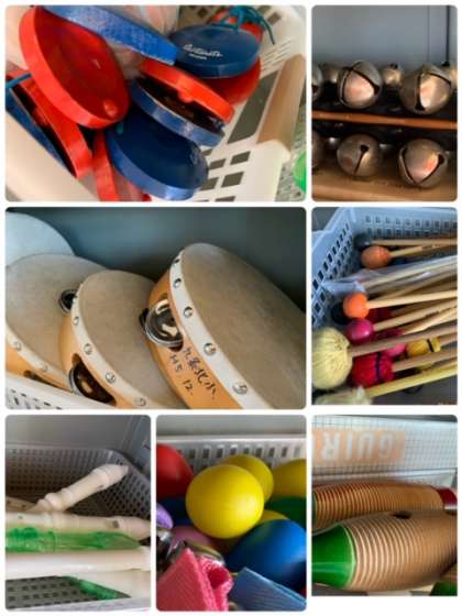 くじょうきた しょうがっこう の 「おんがくしつ」 には、 たくさん の がっき が あるよ。