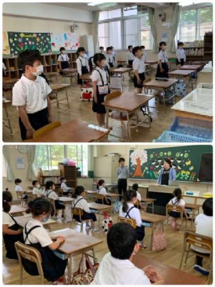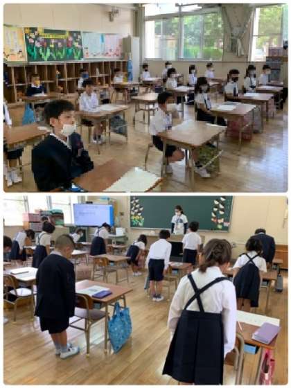 5月18日(月)、1年生の初めての登校日です。朝、校門のところで迎えると、「今日、早起きしたの。」とうれしそうに伝えてくれた児童がいました。登校するのが、とても楽しみだったようで、笑顔で登校してきました。先生たちも、とてもうれしいです。