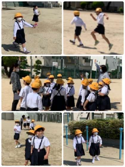 「学校探検」をしました。運動場や中庭を見て回って、いろいろな物を発見しました。 給食室を紹介してもらったときは、「明日から給食あるの?」「早く給食食べたい。」「(考えていたら)おなかすいた〜!」などの声が上がっていました。