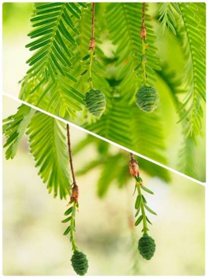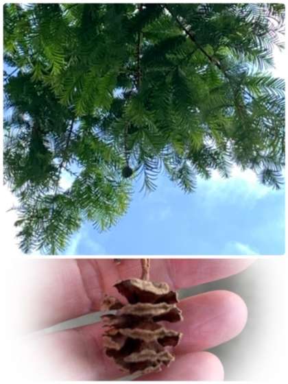 周りの木を見上げてみると・・・。どうやら、「メタセコイヤ」の実(球果)のようです。
