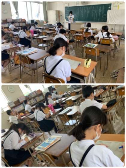 5年生の様子です。算数のプリントの答え合わせをしているところです。