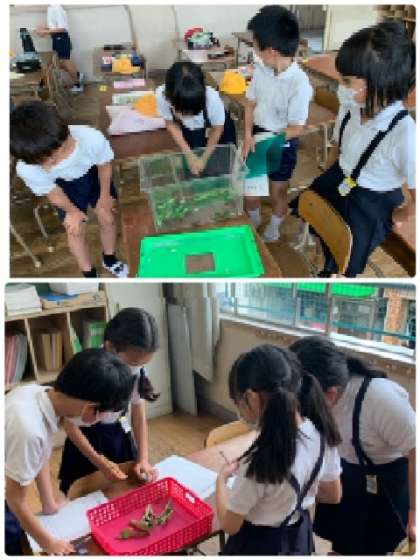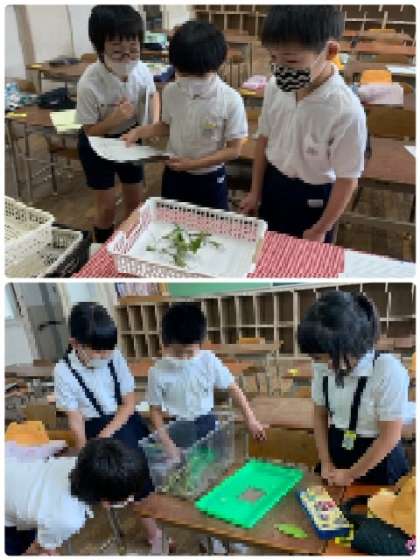 3年生は、「あおむしの観察」をしました。グループに分かれて観察しています。