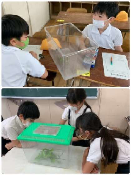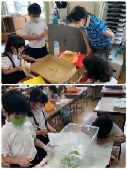 じっくりみながら、観察日記を書いています。3年生児童は、あおむしが成長して、どんな蝶になるのか、楽しみにしています。