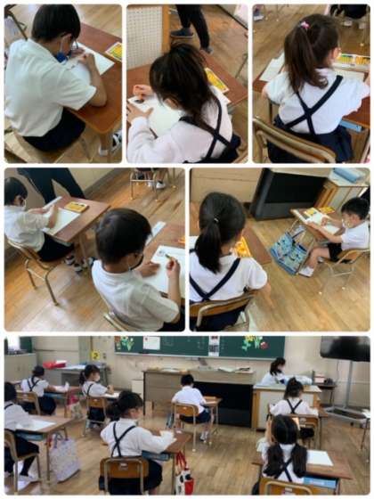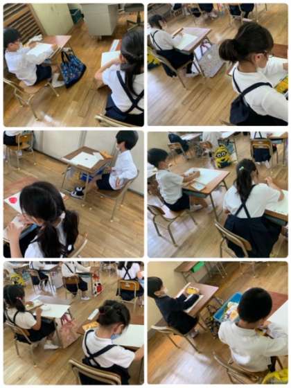 1年生は、クレパスを使って、「好きなもの」を題材に絵をかきました。みんな、それぞれ素敵な絵を描いています。