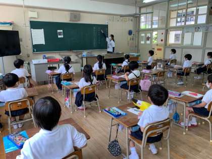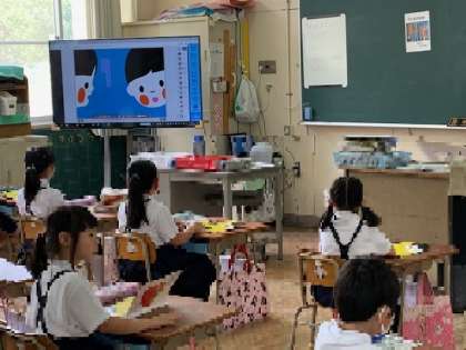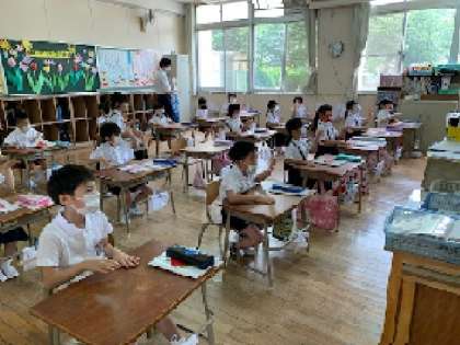 電子黒板をつけて、教科書と同じ画面が出たときに、児童から「あっ、いっしょ!」という声が・・・。みんなで音読をしました。臨時休業中の宿題で、すでに練習をしているので、スムーズに読んでいました。
