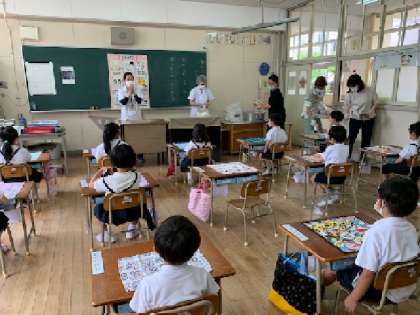 1年生は、初めての給食です。先生から給食の手順を教えてもらいました。いずれは、給食当番の仕事を覚えてもらいますが、しばらくは先生方が準備をしてくれます。