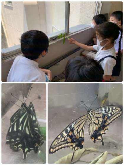 休み時間 公開日 2020/06/02 更新日 2020/06/02 お知らせ 今日の朝、3年生が観察している「蝶の幼虫」が、立派な「アゲハ蝶」に成長していました。一生懸命羽を伸ばそうとしています。休み時間に、3年生が空にはばたくのを手助けしていました。飛び立ったアゲハ蝶は、飛び立つと、桜に木にとまっていました。 いいね(0)