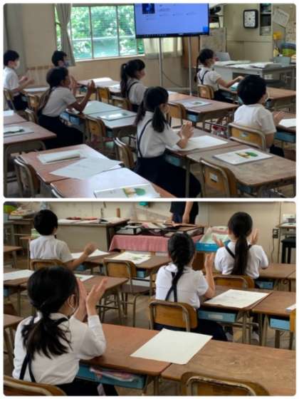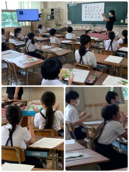 今日の音楽の授業の後半は、「リズムでなかよくなろう」に取り組みました。黒板を示された通りに、手拍子でリズムを取ります。クラスのみんなの気持ちがぴったり合っていました。
