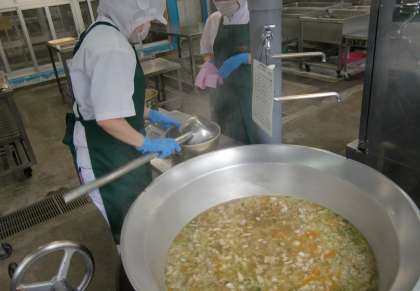 大きな釜で調理して、調理員さんが各クラスに配缶しているのは「豚肉とキャベツのスープ」です。豚肉とキャベツの他にじゃがいも、にんじん、パセリなどの入ったあっさり味のスープです。この釜でおよそ260人分位を一度に作っています。