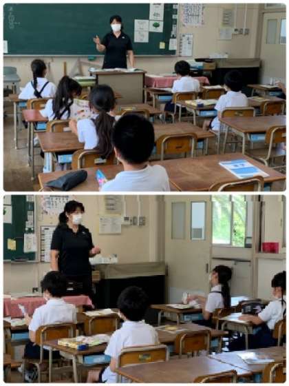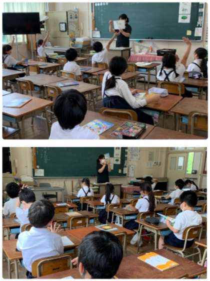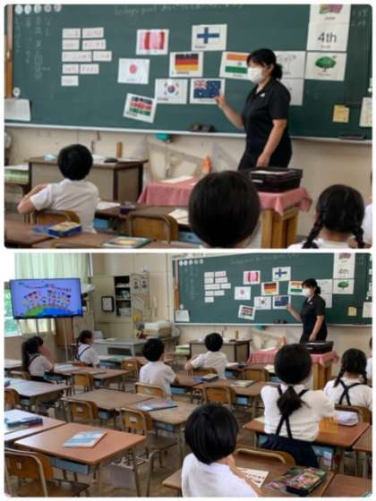 3年生の外国語の授業の様子です。まずは、英語であいさつ。「Today's goal あいさつして友だちになろう」です。自己紹介もしていました。