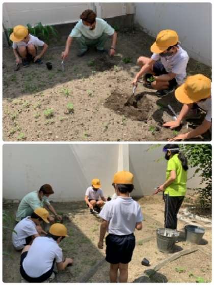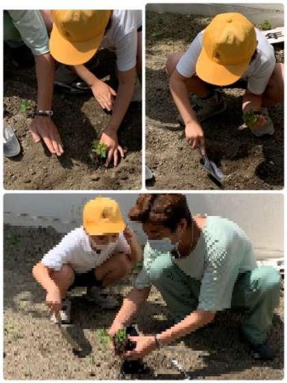3年生が理科の学習で観察している「マリーゴールド」を、学習園に植え替えしました。植え替えする方法を、管理作業員さんから教えてもらっています。大きく育つのが、楽しみですね。