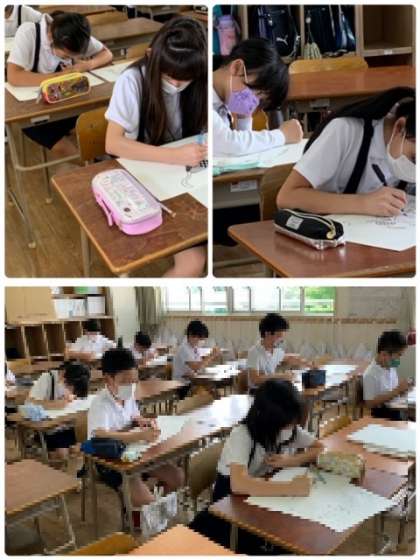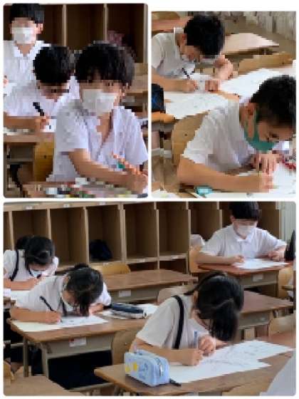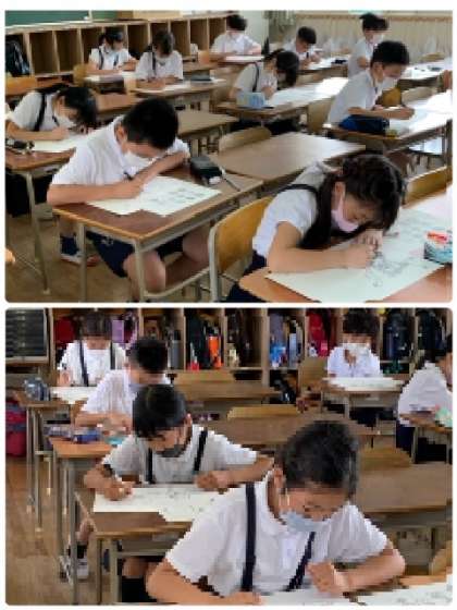「色ぬりが大変」という児童のつぶやきに、「禅だからね。」と答える先生。4年生は、もくもくと作品づくりをしていました。描いている猫の構図には工夫があり、できあがりが楽しみです。