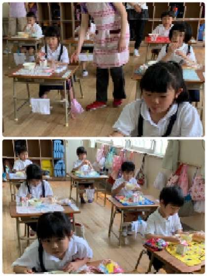 6月9日(火)、今日の献立は「おさつパン、五目汁、牛乳」です。 1年生の給食の様子です。