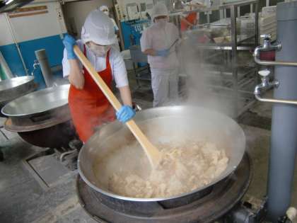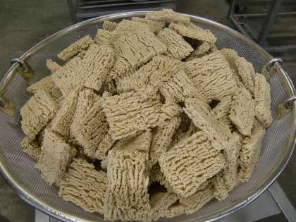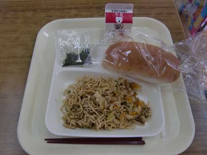 今日の給食は「コッペパン、焼きそば、牛乳」でした。給食の焼きそばは、乾麺をさっとゆで、具材と合わせて炒めています。小袋に入ったきざみのりをかけて、みんなおいしそうに食べていました。