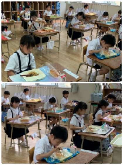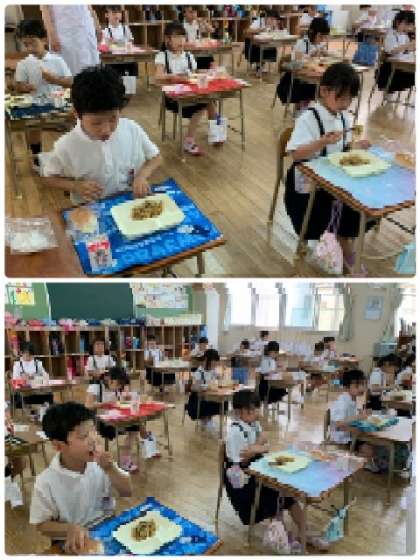 1年生の給食の様子です。みんな、お箸を上手に使って、おいしくいただいています。