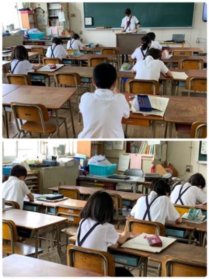 4年生の算数の授業の様子です。まず初めに、前回の学習のふりかえりプリントをしました。