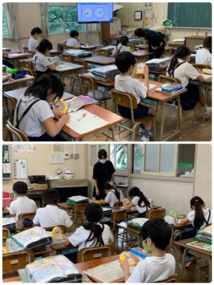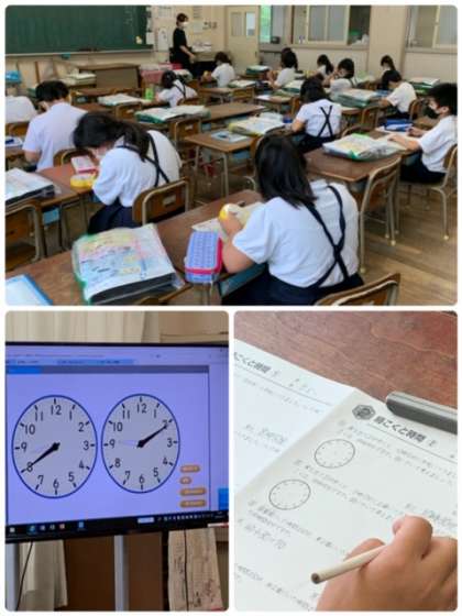 実際に「とけい」の教具を使って、考えています。みんな、しっかり考えて、答えを出していました。