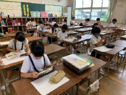 3年生の国語の授業の様子です。ふりかえりテストをしています。テストが終わった児童は、学級文庫から好きな本を探して、静かに読書をしています。