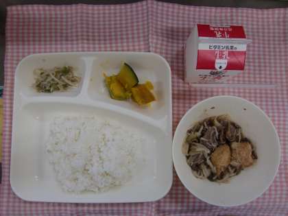 今日の給食は「ごはん、すき焼き煮、焼きかぼちゃの甘みつかけ、もやしとピーマンのごまいため」でした。今日の給食がごはんだとわかると、子どもたちから「やったぁ!」「今の学年になって、初めてのごはんや!」と大歓声。パンもおいしいですが、ごはんはやっぱり大人気です。甘辛いすき焼き煮がおかずで、ごはんがすすんだようです。