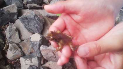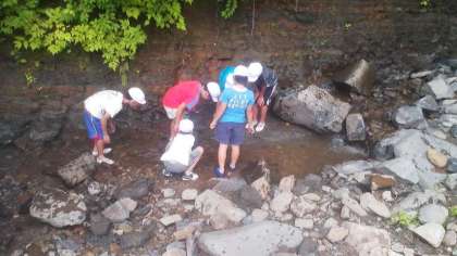 7月27日土曜日10時15分、5年生は小川で川遊びを楽しんでいます。カエルを見つけた子もいるようです。