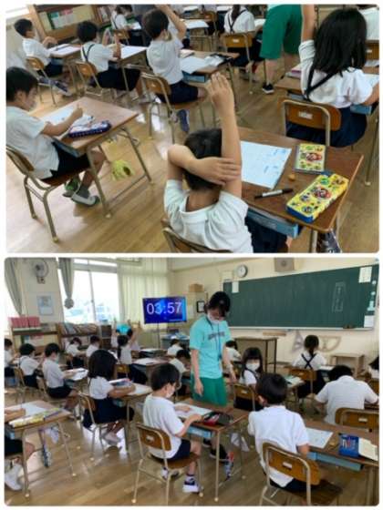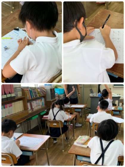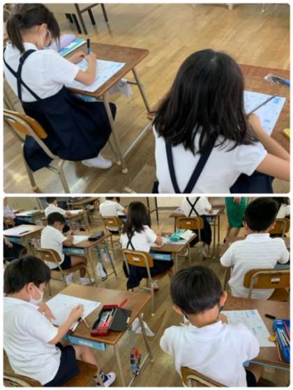 2年生の国語の授業の様子です。「ひらがな」と「カタカナ」を並べて書いて、比べています。正しい姿勢で、ていねいに書いています。