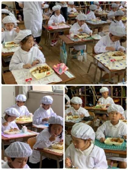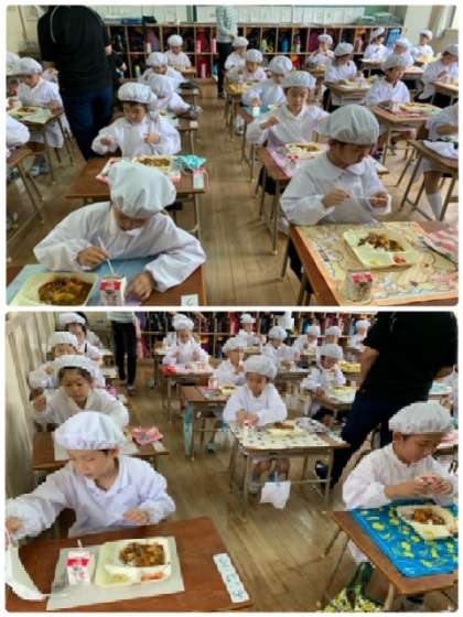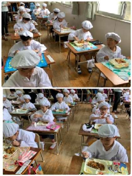 「おいしい!」とつぶやきながら、食べています。今日は、特に児童たちが好きな献立のようです。ラッキーにんじんが入っていた児童は、うれしそうに、そっと見せてくれました。サクランボも、1年間に一回、この時期だけのもののようですよ。