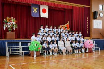 子どもたちは、手拍子に合わせて行動に入場し、とても立派な姿で席につきました。お祝いのことばも、学校長とPTA会長だけでしたが、「起立」「礼」の号令に合わせてきびきび動く子どもたちのようすからは、すっかり小学生になっていることを感じさせてくれました。