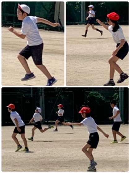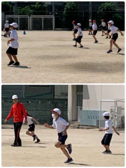 4年生の体育の授業の様子です。ポイントまで往復します。行きは「後ろ向き」で走って、帰りは「前を向いて」走っています。次は、「後ろ向き」と「後ろ向き」。先生の指示によって、走り方が変わります。