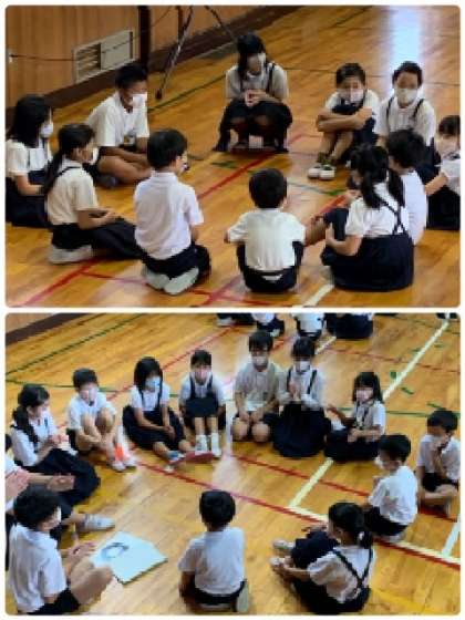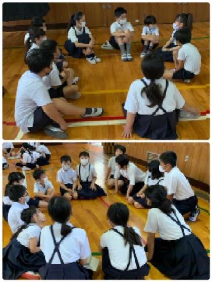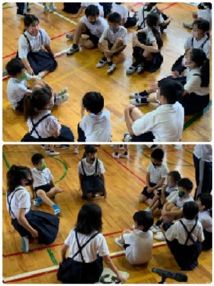 「自己紹介ゲーム」をしています。班のお友だちの名前を覚えれたかな。