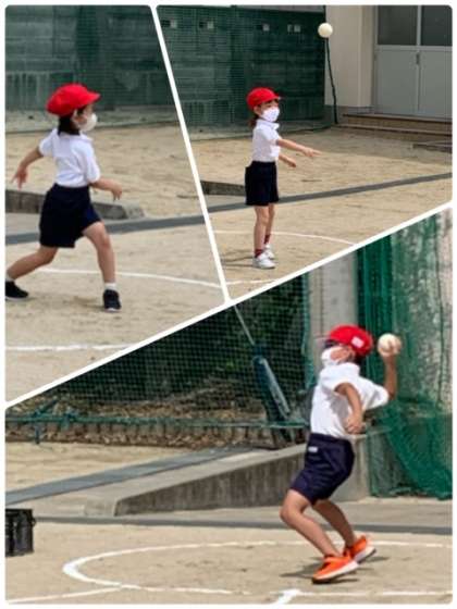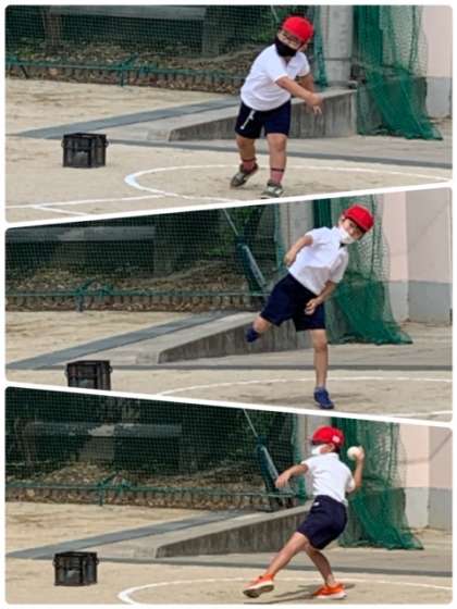 1年生が、初めて「新体力テスト」に挑戦しました。まずは、「ソフトボール投げ」をしています。