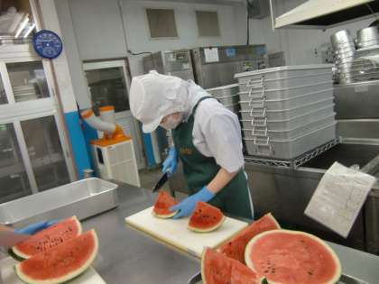 7月が始まりました。今日の献立は「おさつパン、かぼちゃのミートグラタン、スープ、すいか、牛乳」です。すいかは、給食では1年に1回登場します。今日のすいかは鳥取県産。1玉のすいかを64等分します。切っている様子を1年生に動画で見せると、「大きい!」「調理員さんすごい!」とみんなびっくりした様子。夏を感じる今日の給食でした。